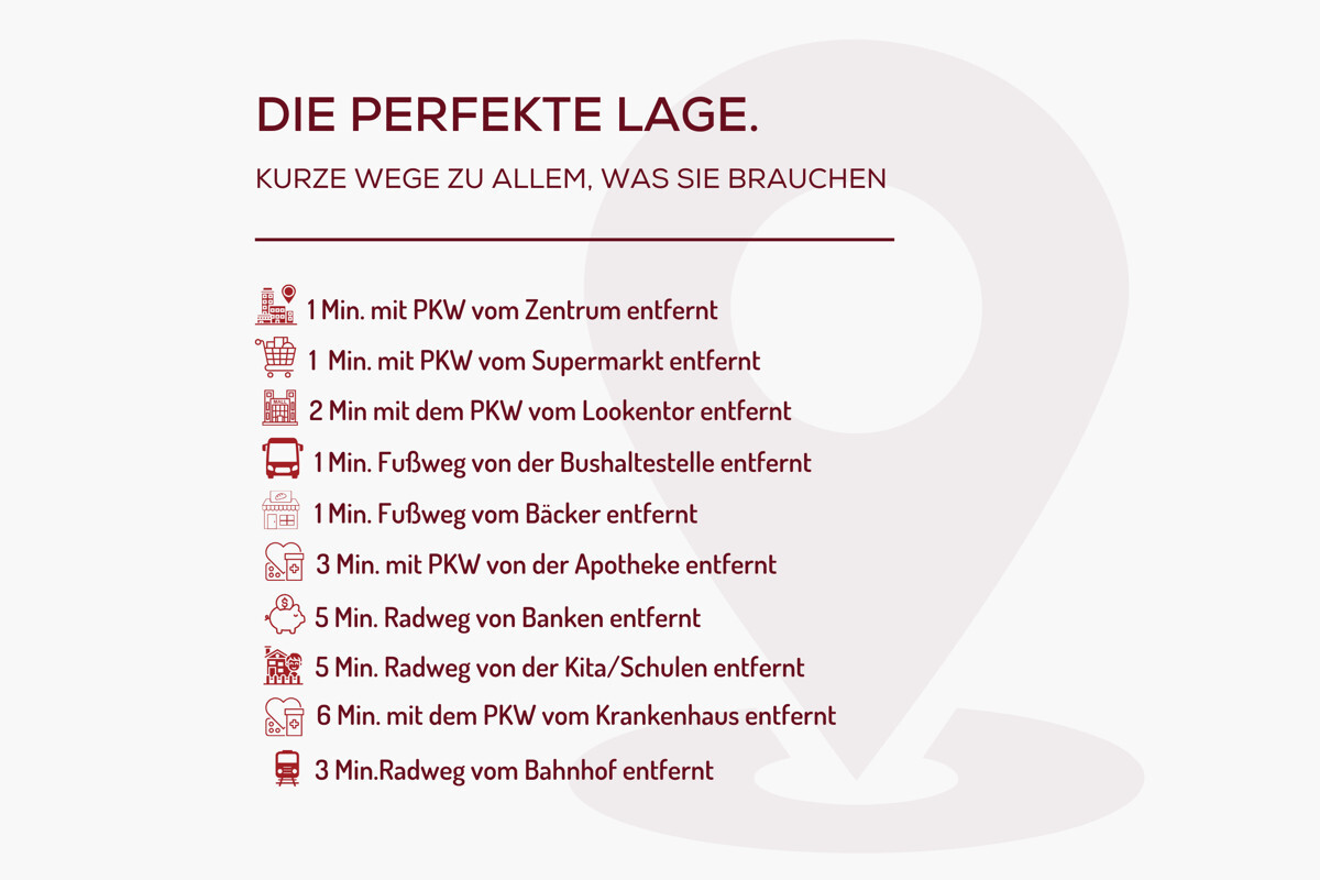 Die charmante Stadt Lingen mit etwa 58.000 Einwohnern ist eine Perle inmitten der wunderschönen Region im Emsland und bietet ein attraktives Wohnumfeld für Jung und Alt. Hier finden Sie die perfekte Balance zwischen städtischem Leben und ländlicher Ruhe. Zahlreiche Einkaufsmöglichkeiten für den täglichen Bedarf, darunter Supermärkte, Bäckereien und Apotheken, befinden sich in unmittelbarer Nähe. Auch das Einkaufszentrum Lookentor und zahlreiche Restaurants sind schnell zu Fuß erreichbar.