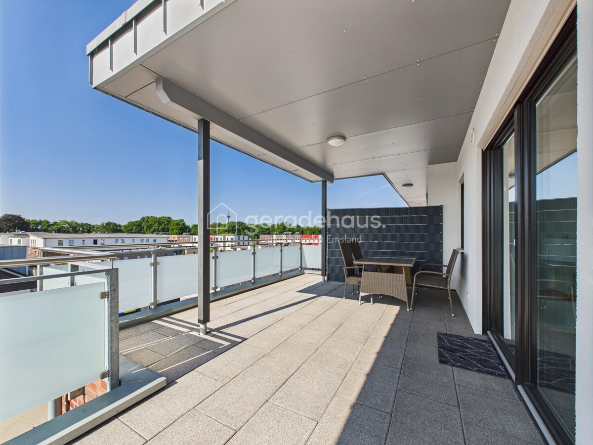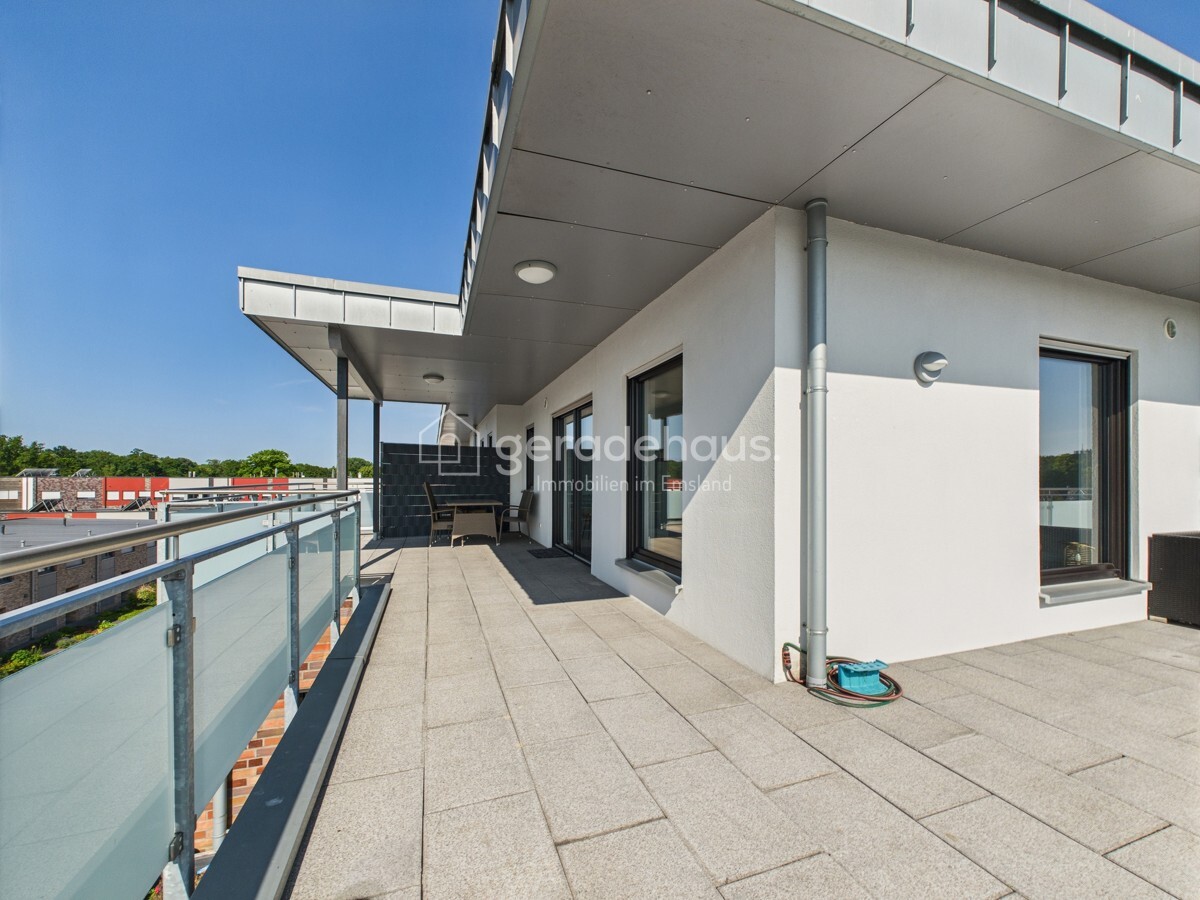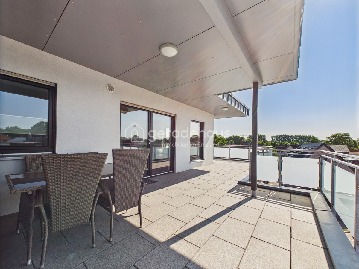 Die sonnige Dachterrasse mit Ausblick auf den Emsauenpark ist das Highlight dieser Wohnung – ein Ort für Ruhe, Genuss und Rückzug inmitten der Stadt.