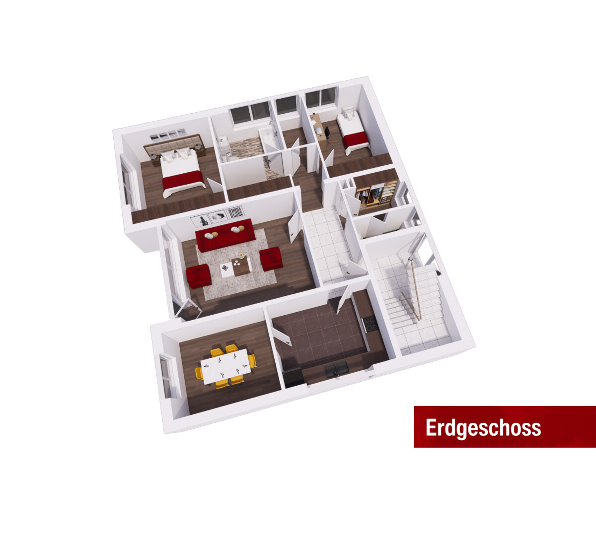 Die Erdgeschosswohnung besticht durch einen praktischen Schnitt und helle Räume. Ein L-förmiger Flur führt zum 22 m² großen Wohnzimmer mit Balkon, separatem Esszimmer, geräumiger Küche, zwei Schlafzimmern, Abstellraum, Bad und Gäste-WC. Sie bietet viel Platz für Familien oder ein Homeoffice.