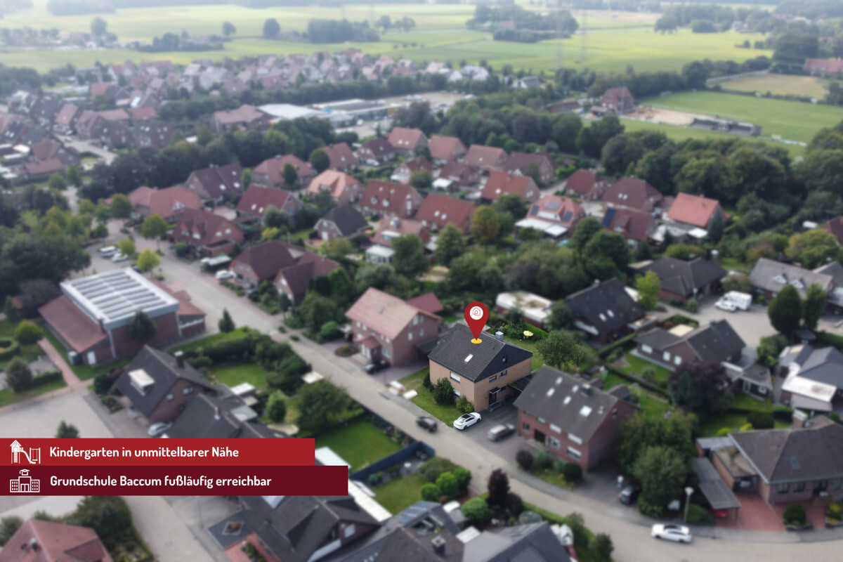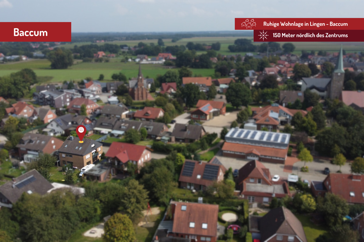 Baccum vereint den Charme ländlicher Idylle mit der Nähe zur Stadt Lingen, die in nur wenigen Minuten erreichbar ist. Diese Kombination macht die Lage besonders attraktiv für Mieter, die ein ruhiges Wohnumfeld mit gleichzeitig guter Infrastruktur suchen. Die gepflegte Umgebung, geprägt von traditionellen Fachwerkhäusern und weitläufigen Grünflächen, sorgt für eine hohe Lebensqualität und steigert die Attraktivität der Immobilie.