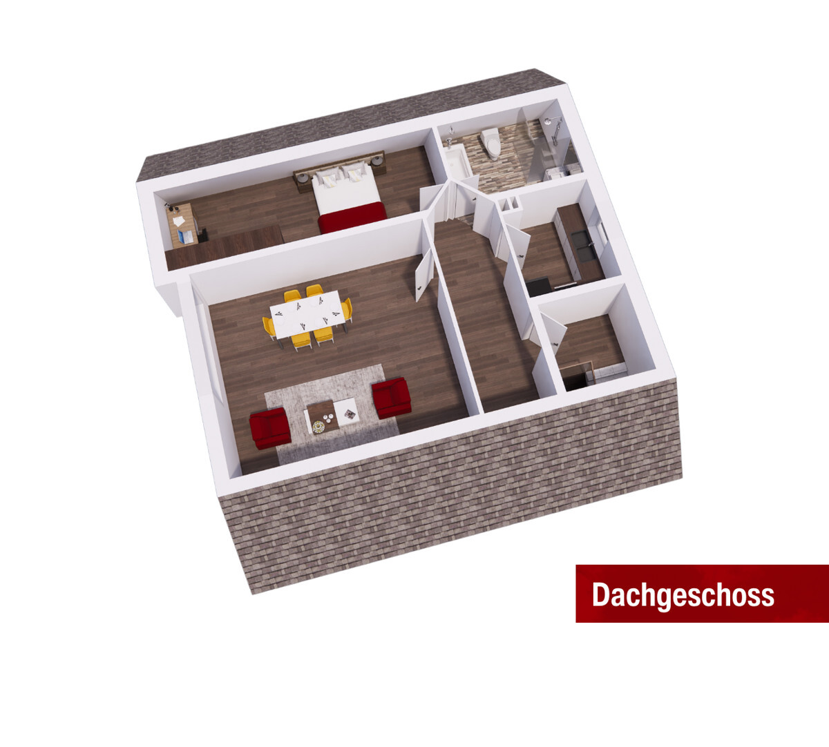 Im Dachgeschoss befindet sich eine 2-Zimmer-Wohnung mit 70,53 m². Der großzügige Wohn- und Essbereich sowie das geräumige Schlafzimmer schaffen eine gemütliche Atmosphäre. Auch diese Wohnung ist vermietet und bringt langfristige Einnahmen.